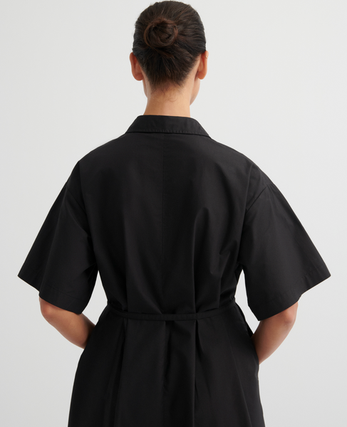 An oversized shirt dress with utilitarian-inspired details, including front patch pockets, side seam pockets, and a thin belt for versatile styling. Falling to a midi length, it features a classic collar and fastens with nut buttons through the front placket. Style as a dress or layered over pants as a tunic. Crafted from crisp organic cotton poplin. All Fairtrade organic cotton. All plastic-free.