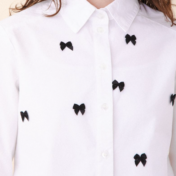 Feeling pretty and polished? The Best in Show shirt brings both to the table -classic tailoring meets unexpected charm. Made from crisp cotton poplin with a rounded hem, and engineered fit, this button-up is adorned with soft satin bows, blending structure with softness. A little bit of happiness, cleverly disguised as a shirt.