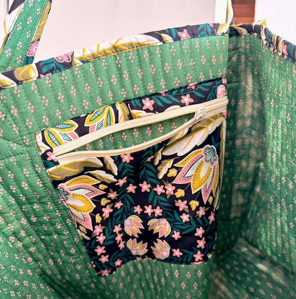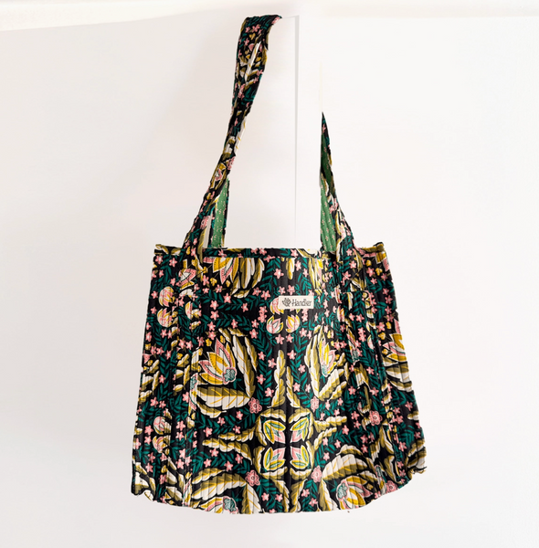 The Betty Quilted Bag is a versatile tote designed for everyday use. Crafted from premium 100% bandana cotton with quilted construction, it offers both softness and durability. Measuring 16" x 12" x 7", the bag provides ample space for work essentials, travel items, or personal belongings. Wide double shoulder straps distribute weight comfortably, while an interior zipper pocket secures valuables. Signature Handker prints appear throughout the design, including the lining. This tote transitions seamlessly from professional settings to casual outings.