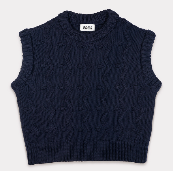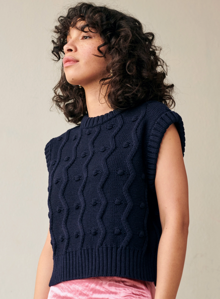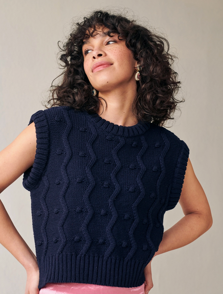 The Bubble Vest is embellished with zig-zags and mini pom-poms, lending a joyful tactility to this versatile shape. Making out as an ideal seasonal transition piece, don this sweater with underpinnings like tee shirts, turtlenecks, or even button-ups. It has that throw on kind of quality so you might also think to layer it over dresses and overalls, too. Crafted out of our soft Merino wool, this vest is both comfy and easy to wear, with a silhouette that is generous and slightly cropped.