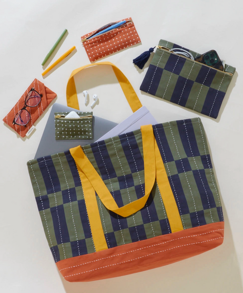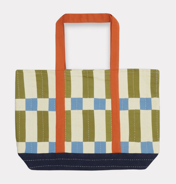 The newest canvas tote bag is as versatile as it is functional. The delicate hand-embroidered kantha stitch adds a level of character and texture to the classic check design. Constructed with a durable duck cotton canvas lining, this striped tote bag features an interior slip pocket to help better organize your most used items. Whether running errands or exploring farmer's markets, this bag is the perfect companion for all of life's adventures.