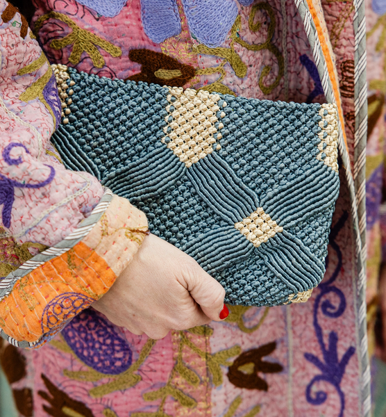 This elegant macramé clutch is handcrafted by skilled artisans at the Rahab's Rope Vocational and Developmental Center in Goa. It showcases a beautiful decorative interweaving of knotted cords, featuring intricate patterns and an assortment of shades. The interior is lined with recycled silk and measures approximately 9" in length and 6" in height.