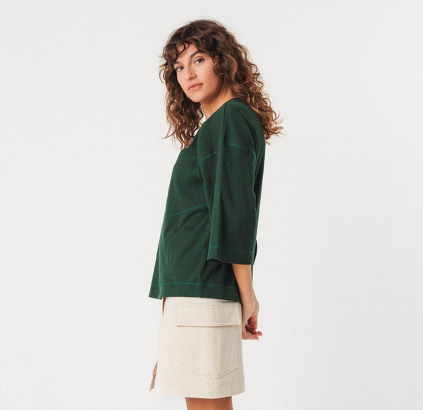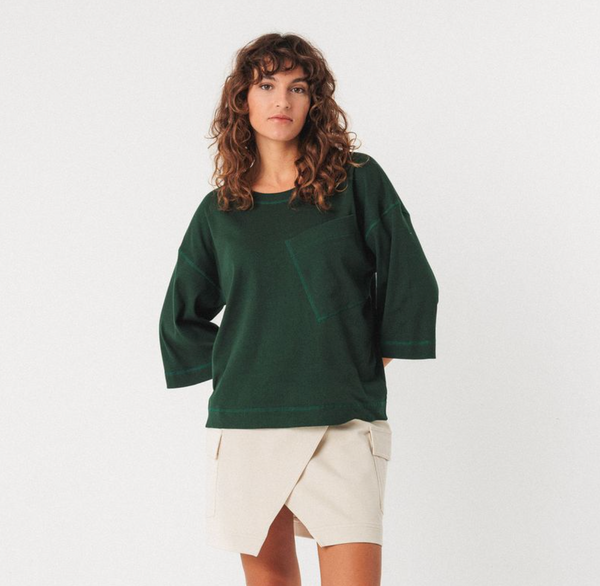 Loose fit T-shirt. Round neck. Below-the-elbow sleeve length. Chest pocket. Overlock detail at seams.