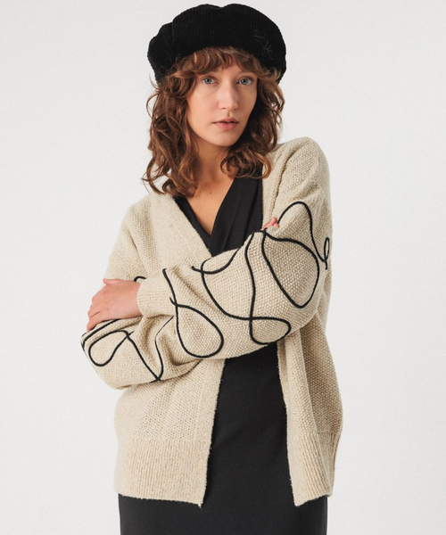 Recycled materials tricot cardigan. Midweight. Without collar. Long sleeves with embroidery artwork. Made in Portugal.