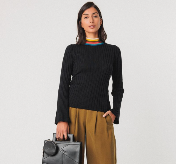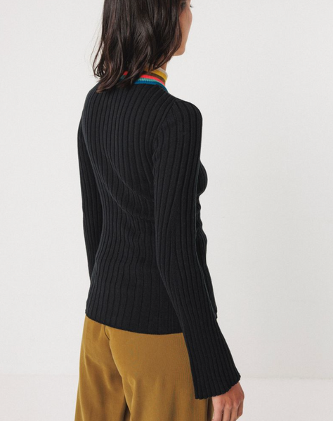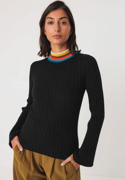 Ribbed tricot top. High multicolor collar. Long flared sleeve. Lightweight.
