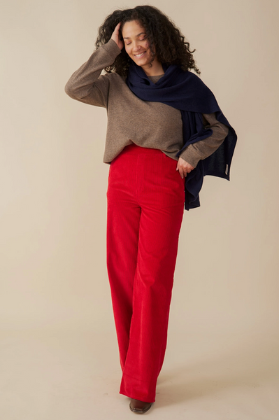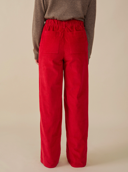 * 100% Cotton * 6 wale corduroy 330gsm * New fit * High rise wide leg trouser * Fitted through waist and hip with elasticated back waist * Hidden side zipper and button closure * Front slash pockets, back patch pockets * Belt loops and faux fly top stitching * Inseam 29" with wide hem that can be let out for additional length. Designed to be full length with heels * Made fair trade in India by one of our longstanding production partners Wash care instructions. Turn inside out before washing. Machine wash cold, hang dry. Iron garment inside out on warm setting or steam as needed.