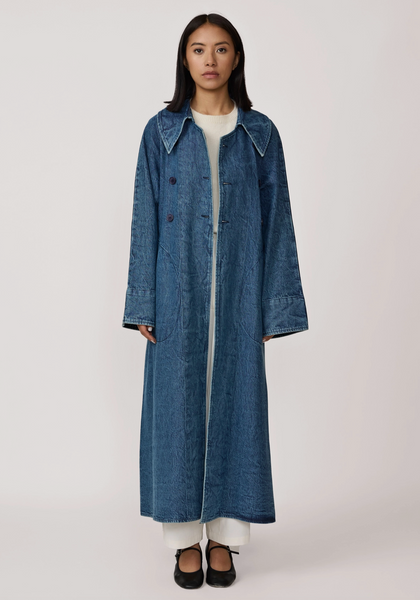 The Marin Trench features a double-breasted A-line silhouette with classic details, including a storm flap, classic buttons, and a bold wide collar, ideal for popping up in chillier weather. Available in two options—organic cotton corduroy for a textured look or organic cotton-washed denim for a relaxed finish—this trench promises to keep you warm and well-layered all season long. Stylist Note: