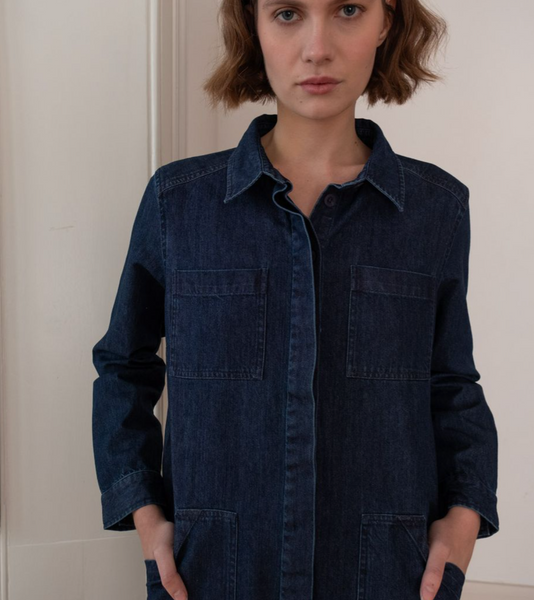 The Ocean Shirt Dress is shorter shirt dress in midweight blue cotton denim. Its loose-fitting shape means it can be worn alone, as a tunic, or as a long overshirt. The dress is finished with two pockets at the chest and two large carpenter patched pockets. It’s a casual style that shows our love of practical, comfortable pieces that you’ll wear again and again. Button-down placket (buttons are covered). Full-length buttoned sleeves. Falls above the knee.