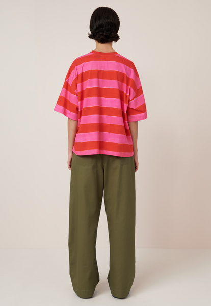Oversized Boxy Tee is designed for an easy, off the body fit and is finished with a classic crew neckline. Crafted from midweight organic cotton jersey, this tee features our hand-painted red and pink stripe. All Fairtrade organic cotton. All plastic-free.