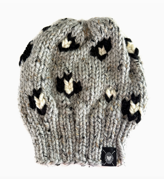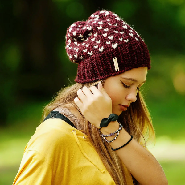 Our slogan is, "Hand Knit with Heart(s)". The (S) to reflect both our penchant for using hearts in our designs, as well as to reflect the amount of love and care Nicole Brown and her team put into the knitwear itself. The quality you will find in our hand knit pieces is paramount. Our yarn is thoughtfully sourced, our faux fur pom-poms made one at a time in the USA, and our pieces are not only stylish, but truly designed to keep you warm in the colder months.