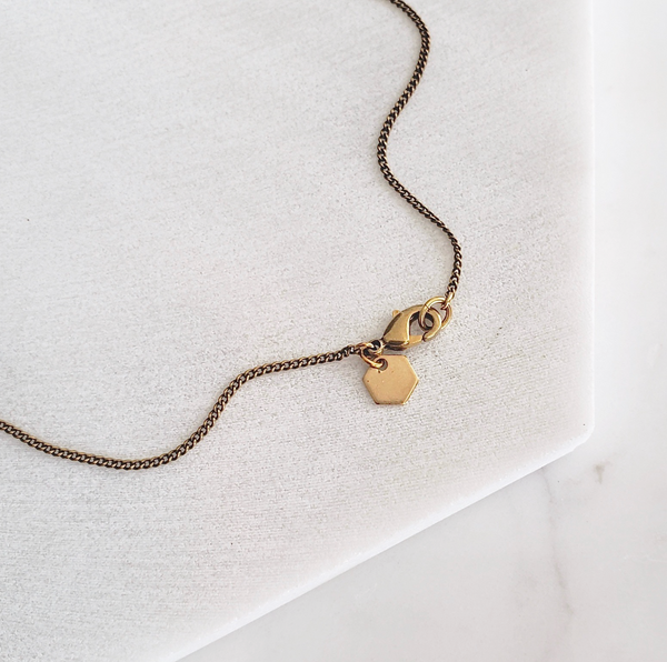 A delicately curved brass tube strung directly onto an aged brass chain. The result is simple, bright, and a little bit boho. Other sizes (pictured) available. Size: 24” chain, the curve is 1 3/8" wide x 3/4" tall. Materials: raw brass curve, nickel-free brass chain.