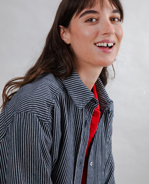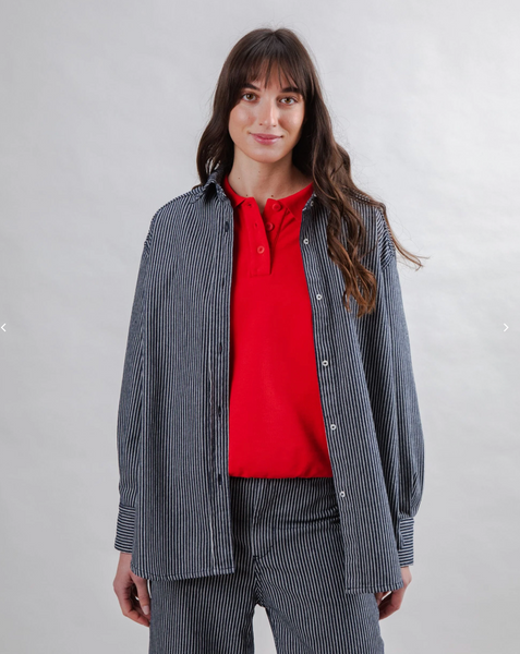 The Striped Denim Long Overshirt in black offers a perfect blend of casual edge and refined detail. Soft organic cotton meets timeless stripes and a relaxed fit, making it ideal for creative days or urban adventures. Sustainably made to keep your wardrobe thoughtful and fresh.