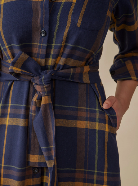 Channel relaxed 1970s sophistication in this midi-length button-up shirtdress features a bold navy yellow plaid, a curved hem, and hidden pockets. The vintage-inspired relaxed fit features optional belt styling that creates a defined waist, in a versatile winter-weight cotton twill.