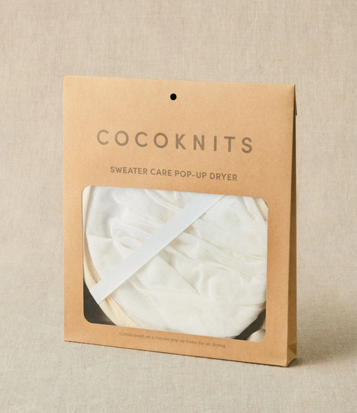 This Sweater Care Pop-up Dryer is plastic-free and made with eco-friendly materials including: cotton mesh, metal D-rings, and a silicone sleeve for the internal wire edging. The Pop-up Dryer helps air-dry hand washables more quickly by allowing increased airflow above and below your garment. Simply open the Pop-up Dryer, adjust the straps with the D-rings, place it on a towel, blocking mat, or water-resistant surface, and lay your damp item over the mesh. Whether they are machine or hand washable, this dryer will help your knits look their best for years to come.