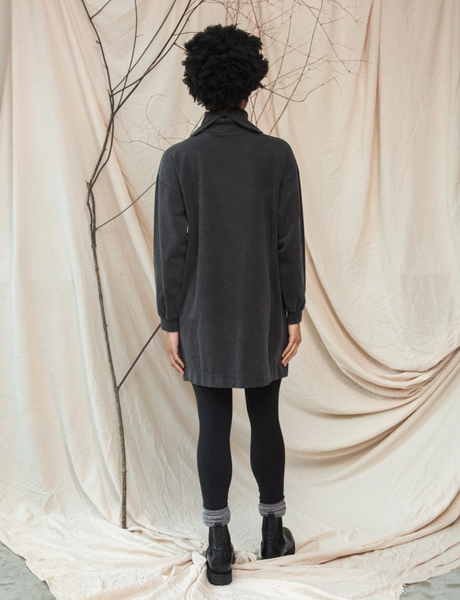 The Tricia is a funnel necked sweatshirt dress with an above knee hemline, straight cut skirt, and two integrated front pockets.